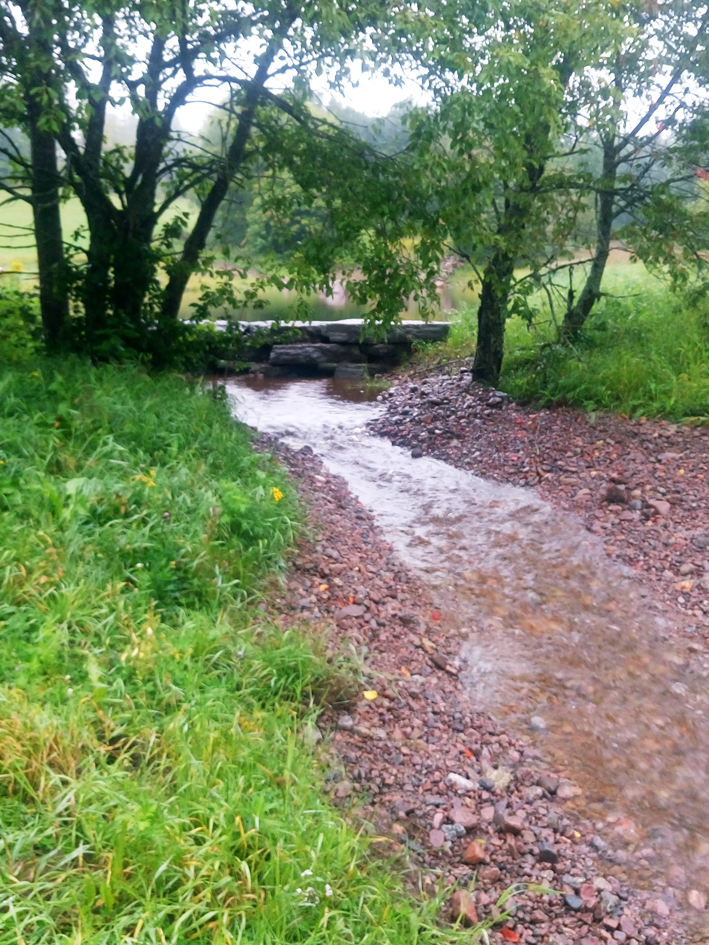 Nu rinner det vatten i bäcken igen - till och med mycket vatten! Under sommaren var det lite nederbörd, så pass lite att bäckfåran och dammarna nästintill torkade ut. Men nu har regnet kommit och det har börjat rinna mycket vatten i bäcken. I huvudsak är det positivt, men det har fått ett par följdeffekter. Viss erosion har uppstått, och en del av bentonitduken tittar fram. På något ställe har vattnet valt att ta en annan väg.